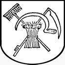 im Zentrum des Wappens steht eine Ährengarbe, die überwölbt wird von einer Sichel, dahinter sind nach links gekreuzt ein Rechen und nach rechts eine Sense, die Farben dieses Wappens können nur vermutet werden